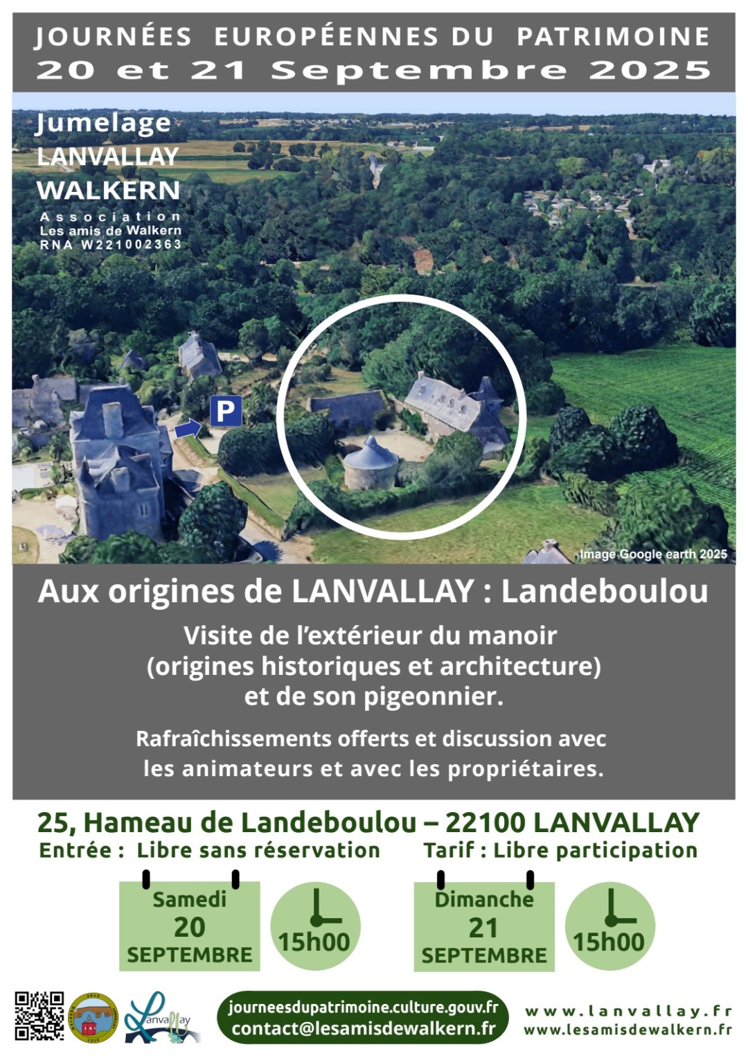 À l’occasion des Journées Européennes du Patrimoine 2025, nous avons le plaisir de vous convier à une visite exceptionnelle, organisée par le comité de jumelage Lanvallay-Walkern, en partenariat avec Madame et Monsieur Lecoq, propriétaires du manoir de Landeboulou, à Lanvallay.